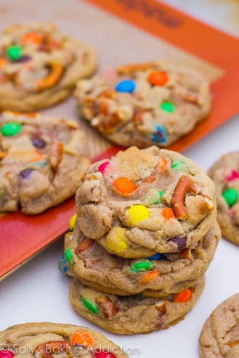 4.Roll balls of dough with your hands (about 1.5 Tablespoons of dough per cookie) and drop onto the cookie sheet. Make sure the balls of dough are taller, rather than wide. Please see above for more on a "tall cookie dough ball." Press a few M&Ms or pretzels onto the tops of cookies for looks, if desired. Bake for 8-9 minutes, until barely golden brown around the edges. Do NOT bake them longer than 10 minutes. Remove and let cool for 3 minutes on the cookie sheet. If the cookies are too puffy, try gently pressing down on them with the back of a spoon. Transfer to cooling rack. Cookies remain fresh in an airtight container for up to 7 days.