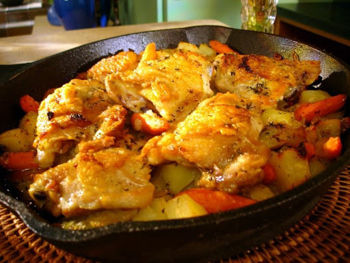 Pre-heat oven to 500 degrees, fan on if possible. In a large bowl, mix all the ingredients together and season well with kosher salt and freshly cracked black pepper. In a saute pan, roasting pan or cast iron pan coated lightly with oil on medium-high heat, sear the chicken thighs first, skin side down until brown then flip until brown, about 6-8 minutes total. Remove the chicken and add the rest of the bowl. Sautee for 8 minutes until soft then top with chicken, skin side up. Roast in the oven for 15-20 minutes until juices run clear when chicken is pierced and veggies are cooked thru. Serve family-style on platter.