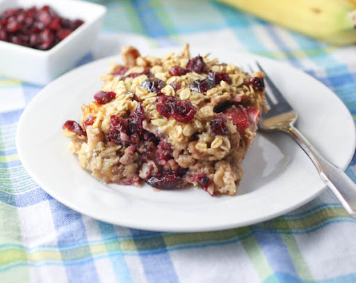 Arrange the bananas in a single layer in the prepared pan. Sprinkle two-thirds of the berries over the top, cover the fruits with the oat mixture. Slowly drizzle the milk mixture over the oats. Make sure the milk covers the oats. Scatter the remaining berries, remaining walnuts and cranberries across the top.
