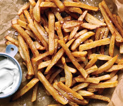 Heat oven to 450°. Cut potatoes in half horizontally; cut each half into 1/3-inch-thick fries and place in a bowl of cold water. Remove from water and dry thoroughly. Toss with oil and sprinkle with salt. Place fries on a cookie sheet. Roast until browned and cooked through, turning occasionally, 25 minutes.