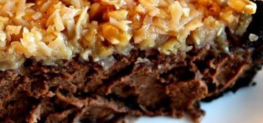 In a mixing bowl beat cream cheese until it's smooth. Beat in the German chocolate, brown sugar and cocoa. Add eggs and beat just until combined. Add the vanilla and almond extracts.