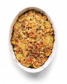 Layer-and-bake dishes offer ways to turn leftovers into something luscious -- and they're ideal mediums for healthful ingredients. In this dish, a little Gruyere cheese provides a decadent texture, while sweet potatoes, leeks, and tangy grated apple make the dish especially moist, so you can use less fat.