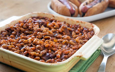 Cook bacon and set aside. Use bacon grease to brown 1/2 - 3/4 bell pepper & onion. Cut up bacon and put back into peppers & onions. Add everything else and heat until liquid cooks down. Add more brown sugar if needed to sweeten.