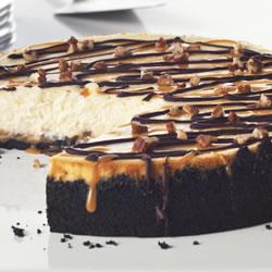 7. Once the cheesecake has completely cooled place it on a serving plate. Put a few tablespoons of caramel sundae syrup into a ziplock bag and snip the corner. Drizzle caramel on cheesecake. Melt chocolate chips in microwave for 30 seconds at a time, until melted. Repeat process with ziplock bag and drizzle on cheesecake. If you’re careful you can put the caramel syrup on one side of the bag and use the other side for the chocolate. Sprinkle with toasted pecans. Keep refrigerated until serving.