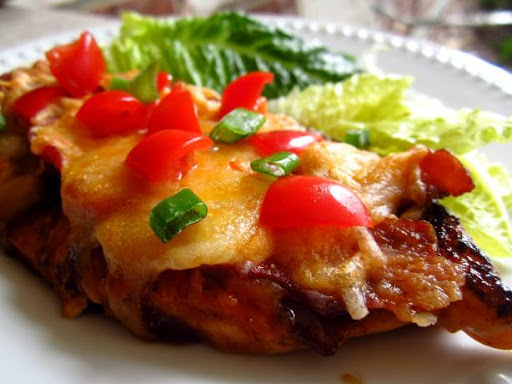1 Pound chicken breast until it is somewhat flattened, and season with salt and pepper. 2 Spray Pam in a nonstick skillet, and cook chicken breast until it is done. 3 Transfer to a serving plate. 4 Top chicken breast with Barbeque sauce, bacon, and cheese. 5 Broil chicken breast in the oven, or melt the cheese in a microwave. 6 Sprinkle with a small amount of cold chopped tomatoes and chives.
