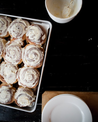 Spread the frosting over the tops of the cinnamon rolls while still warm. Serve.
