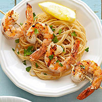 4. To serve, divide pasta among four serving plates. Top with shrimp on skewers. Sprinkle with parsley. Squeeze lemon wedges over shrimp. Drizzle with olive oil.