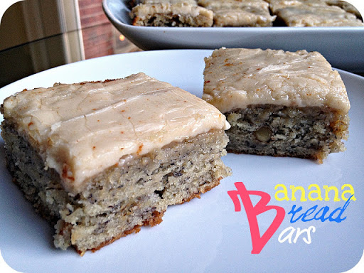 Heat oven to 375F. Grease and flour 15x10-inch jelly roll pan. For the bars, in a large bowl, beat together sugar, sour cream, butter, and eggs until creamy. Blend in bananas and vanilla extract. Add flour, baking soda, salt, and blend for 1 minute. Stir in walnuts.