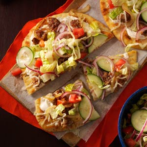 Meanwhile, in a large bowl, combine lettuce, cucumber, tomato and red onion. Add remaining vinaigrette and pepper; toss to coat. Divide salad among pizzas; serve immediately.