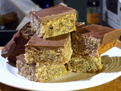 When the flapjack is cooked set it aside to cool. Meanwhile melt the chocolate either in the microwave or in a bowl above a pan of simmering water.