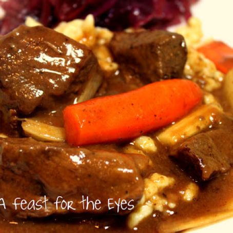 Tasting notes: The carrots aren't mushy at all-- in fact just slightly "al dente" which we liked. The sauce turned out with just the right amount of thickness. The gingersnaps melted right into the sauce, and really gave this sauce an authentic sauerbraten flavor . I have a homemade Spaetzle recipe, but you could serve this over buttered thick noodles or mashed potatoes.