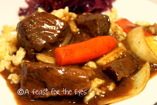 Based on a German dish called Sauerbraten [SOW-uhr-brahtihn],this roast (with a flavorful sauce that is off the charts delicious) takes on sweet and sour flavors from unique ingredients, like pickling spices, vinegar, gingersnaps, and gin (for the juniper berry taste). Authentic sauerbraten marinates for days, but this interpretation lets you have dinner on the table in just a few hours. True to this recipe's claim, my slow cooker made this recipe in four hours. If you've ever had sauerbraten, this recipe nailed it when it came to the flavor. I did just a couple of very minor tweaks. I served this with homemade spaetzle and red cabbage. Don't forget to the beer! Recipes comes from Cuisine At Home Magazine, Issue 103 February 2014. To see plenty of step-by-step photos, click on the recipe source to my food blog "A Feast for the Eyes".