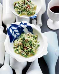 Add enough hot stock to just cover the rice and cook over moderate heat, stirring, until the stock has been absorbed. Add more stock to cover the rice. Continue cooking and stirring, adding more stock as it is absorbed, until the rice is al dente and suspended in a creamy sauce, 25 minutes. Add the pea puree, the remaining peas and the bacon and cook, stirring, until hot. Remove the risotto from the heat and stir in the butter, reserved bacon fat, cheese and lemon juice. Season with salt and pepper. Garnish with the pea shoots and serve.