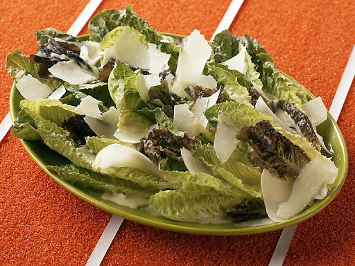 Cut the stems off the heads of Romaine and fan out the lettuce on a serving platter. Sprinkle the Parmesan over the lettuce and drizzle the dressing on top. Serve immediately.