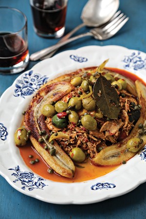 7. To serve, divide a nice portion of ropa vieja between 8 plates and garnish with olives, capers, and half a banana on each.