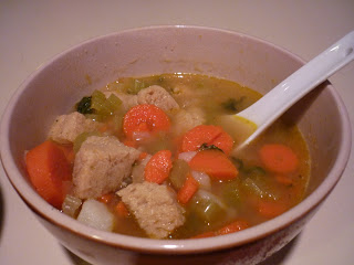 As I had warned, here come the soups. This one was super delicious. I kind of made up the recipe to go along with the veggies I had on hand so you could easily substitute if you have something else in your pantry. This recipe does require you to make or purchase seitan. I recommend making it. I have eaten the pre-made kind and I don’t think it is anywhere near as tasty as when you make it yourself. All you need is wheat gluten flour, some water, a cube or 2 of bullion, and seasonings. You can find my recipe for seitan