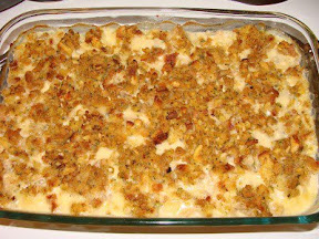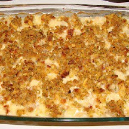 Stir milk and soup together until smooth, and then add 1 cup of the cheese. Stir in chicken pieces, and pour into a 9x13 pan. Spread remaining cheese on top, then cover with prepared stuffing. Bake about 35 minutes at 375 degrees or until chicken is completely cooked.
