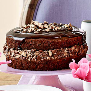 5.Place one layer on serving plate. Add a layer of buttercream. Add cake layer, press 1/3 cup coarsely chopped malted milk balls into sides of buttercream. Pour warm Ganache over top. Then sprinkle with 1/2 cup coarsely chopped malted milk balls.