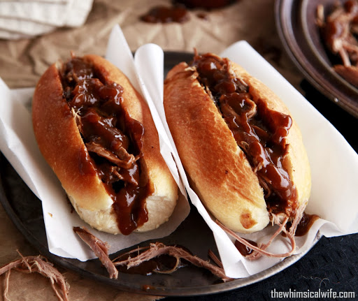 Cut the hot dog rolls through the top cutting about three-quarters of the way through. Smother the inside edges with a little butter and drizzle a little of the gravy in the base of the roll. Stuff the roll with the shredded beef and top with some more gravy.