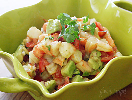 In a large bowl combine chopped shrimp, avocado, tomato, jalapeño. Combine all the ingredients together, add cilantro and gently toss. Adjust salt and pepper to taste.