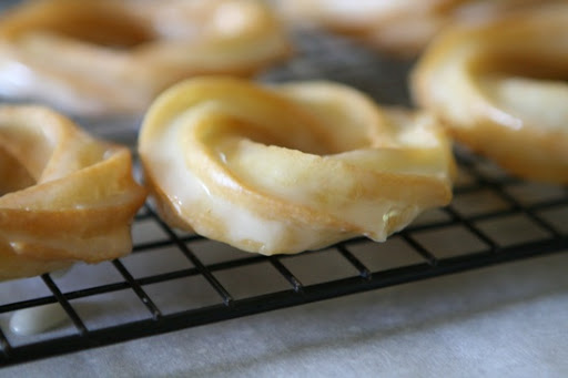 Bring butter and water to boil in a small pot. Once mixture comes to boil, stir in flour and salt until combined. Remove from heat and cool 3 minutes. Crack eggs into a small bowl. Mix eggs into warm mixture one by one until completely batter is completely smooth. Transfer to piping bag with large fluted tip and pipe into circles on parchment paper lined baking sheets. Place into freezer for 30 minutes. Pour vegetable oil into large pot with high sides so there's at least 3 inches of grease. Heat oil to be between 325-350 degrees. While oil is heating, stir all ingredients together for glaze until smooth and runny...but not too runny! Drop frozen crullers one by one into hot oil and fry about 1 minute per side or until lightly golden. Remove to paper towel to drain and then immediately coat in glaze. Place onto cooling rack to let excess glaze drip off. After 40 minutes or so, the glaze should harden onto the crullers. Best served warm, immediately out of the glaze.
