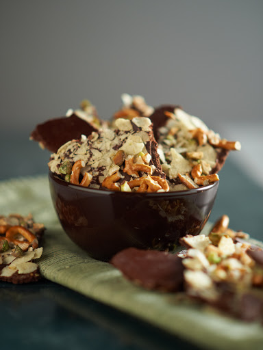 Pour the melted chocolate onto a silicone baking mat and with an offset spatula, spread the chocolate to an even thickness of a 1/8”. Immediately top with the crushed potato chips, pretzels, cashews, and pistachios.