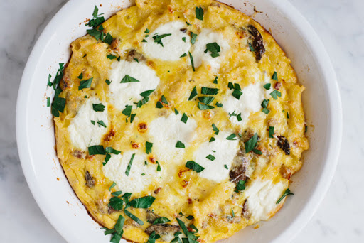 Beat 2 or 3 eggs with about a cup of ricotta and a handful of grated Parmesan in a large bowl. Add pasta leftovers and toss; you will need at least 1 to 2 servings of leftover pasta--if needed, stretch the leftovers with cooked sausage, cubed ham, roasted vegetables, chopped tomatoes, toasted bread cubes, etc. (This dish is forgiving!) Spoon into an oiled pie plate, then top with a mixture of ricotta and grated Parmesan. Drizzle with olive oil and sprinkle with a chopped leafy herb like basil or flat-leaf parsley. Bake in 350-degree oven until heated through and just golden on top, about 30 minutes. Let cool, about 10 minutes, then cut into wedges.