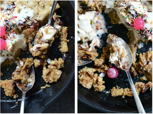 Serve the cookie hot with ice cream, hot fudge, toasted coconut, sprinkles and cherries!