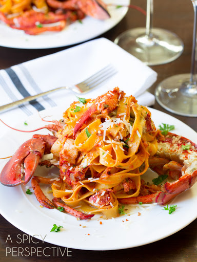 Use a small hammer or meat mallet to crack the lobster claws. Pick the lobster meat out of one whole lobster, leaving the other 2 halves intact. Roughly chop the lobster meat. Add the lobster juices and meat to the sauce and toss in the al dente pasta. Add the cream and toss and cook another 2 minutes. Place the remaining lobster halves on serving plates. Then slather them with more garlic butter. Finally pile the pasta high on top of the two plated lobsters and sprinkle with parmesan cheese.