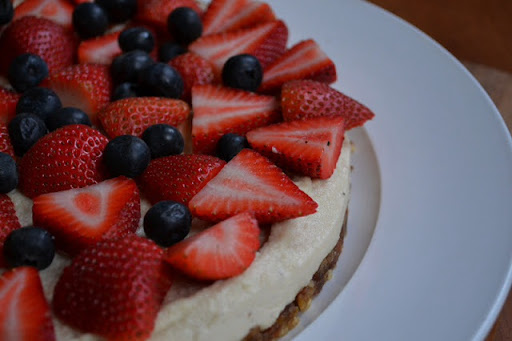 mixture out onto the crust and smooth with a spatula. Place in freezer until solid. (I didn't actually wait for it to be solid). Top with berries.