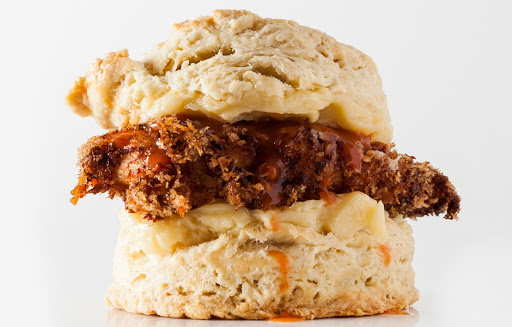 Split biscuits and spread each side with 1 Tbsp. reserved honey butter. Build sandwiches with biscuits, chicken, and hot sauce.