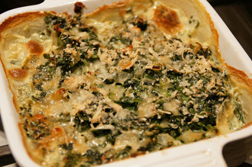 Transfer the spinach to a baking dish and sprinkle the remaining 1/2 cup Parmesan and the Gruyere on top. Bake for 20 minutes until hot and bubbly. Serve hot.