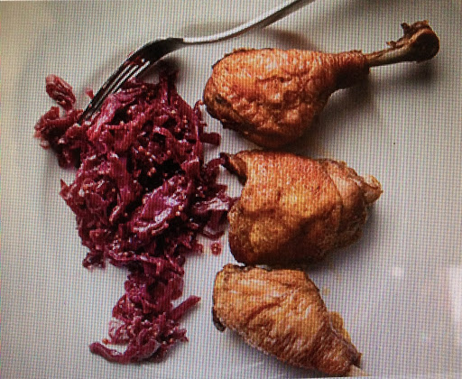 3. Meanwhile, add the bacon to a large skillet over medium-high heat and cook, stirring occasionally, until fat is rendered out and the bacon is crispy , about 5 minutes. Add the onion and cook until lightly browned, about 6 minutes. Add the cabbage, mustard seeds, cinnamon stick, cloves, sugar, white wine and red wine vinegar along with 1 cup of water to the pot. Lower the heat to medium-low and cook, covered, until tender, about 45 minutes. Serve the chicken with the cabbage.