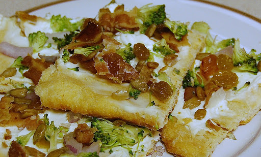 Preheat oven to 350 degrees. Unroll crescent roll dough; do not separate. Roll out dough on Rectangle Baking Stone to within 1 inch of edges of Baking Stone. Bake 12-15 minutes or until golden brown. Remove from oven. Cool completely. Spread softened cream cheese over crust. Chop broccoli, bacon and onion. Sprinkle crust with broccoli, bacon, onion, raisins and sunflower seed kernels. Serve immediately or refrigerate for up to 1 hour. Cut into squares.