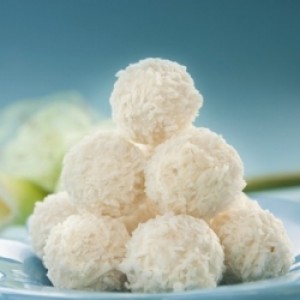 Pour coconut onto a cutting board and roughly chop into smaller size. Roll each ball into coconut, coating well on all sides. Place on prepared baking sheet and continue with remaining balls. Cover with plastic wrap and refrigerate until ready to serve.