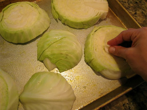 Preheat oven to 400F and spray a baking sheet with non-stick cooking spray. Pull outer leaf off cabbage (it’s usually dirty and nasty looking), cut cabbage from top to bottom (bottom being root) into 1″ thick slices.