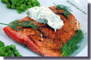 Rub salmon lightly with olive oil; sprinkle with garlic powder, salt and dillweed. Grill on BBQ on medium heat for about 6-8 minutes on each side. Plate and serve with sauce lightly drizzled over it, or on the side … Serves 2-3