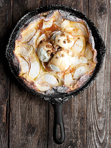 Melt 2 Tbsp. in the microwave and then pour into a blender or food processor. Add the eggs, milk, flour, 1 Tbsp. of the sugar, vanilla extract, and salt. Blend batter until smooth. Let sit in blender, while you prepare the apples.