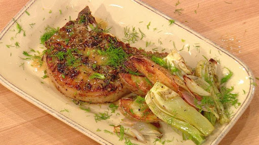 Place chops in shallow dish with 2 tablespoons olive oil, chopped garlic, fennel seed, rosemary, lemon zest and pepper. Season chops with Kosher salt and slather the porchetta seasoning all over the chops evenly, turning to coat both sides. Let stand 30 minutes.