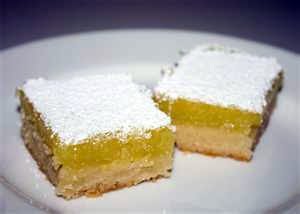 Whisk or sift together flour and powdered sugar; cut in butter until mixture resembles coarse meal (pastry cutter or forks). Pat into ungreased 8” square pan. Bake at 350 for 20 minutes. … Meanwhile, beat eggs until blended and slowly add sugar, beating. Blend lemon juice and rind into egg mixture. Sift/whisk together 2 TB flour and baking powder; stir into egg mixture. Pour over slightly cooled crust. Bake at 350 for 20-25 minutes. Cool. Dust extra powdered sugar on top. Cut into 20 bars.