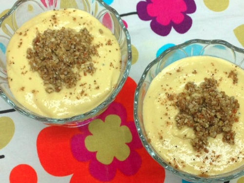 Place some of the nut/seed crumble on the bottom, pushing down gently to form a bottom ‘crust’, then dollop a portion of the custard then sprinkle with more of the nut/seed crumble on top then garnish with a sprinkling of nutmeg.