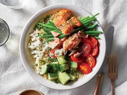 4. To serve, spoon 3/4 cup spinach mixture into each of 4 bowls. Arrange 1/2 cup tomatoes, 1/2 cup cucumber, and 1/3 cup cooked haricots verts in each bowl. Drizzle with remaining dressing; sprinkle with remaining 3/4 teaspoon salt. Top each bowl with 1 flaked salmon fillet and 1 tablespoon feta cheese.