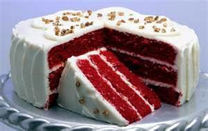 Bobby Flay's cake was a loser to this recipe on Showdown! I've made it several times and it's really good! ... Red Velvet Cake was invented during WWII, when chocolate was rationed. The red food color and very little cocoa powder was intended to give you the feel of chocolate, while using very little of it. True Red Velvet cake has LOTS of red food coloring, and really doesn't taste like chocolate at all