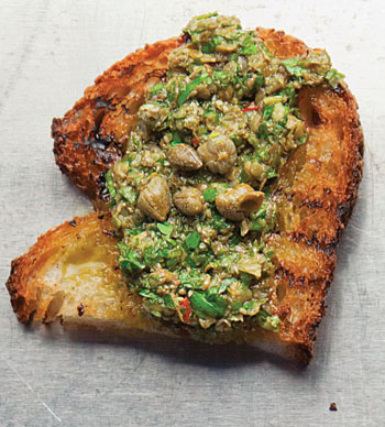 Capers and anchovies lend briny depth to this parsley sauce, which is fantastic tossed with grilled or boiled vegetables.