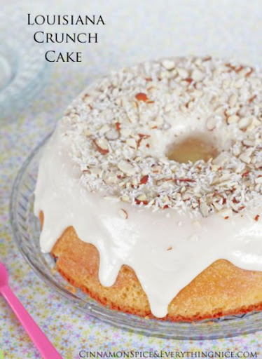 10.Poke holes all over the top of the cake 1/2-inch apart using a skewer or toothpick. Slowly spoon the glaze over the top. Sprinkle with coconut and almonds