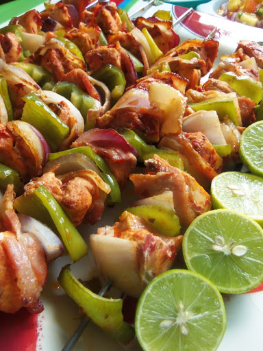 5. When chicken is done marinating, line a large baking sheet with easy release foil paper, set aside. I like to skewer in this sequence: Pepper, onion, bacon, the chicken. Transfer to lined baking sheet as you finish each skewer. When you are all done there should be about 5 to 6 pieces of chicken on each skewer. Yields 10 skewers.