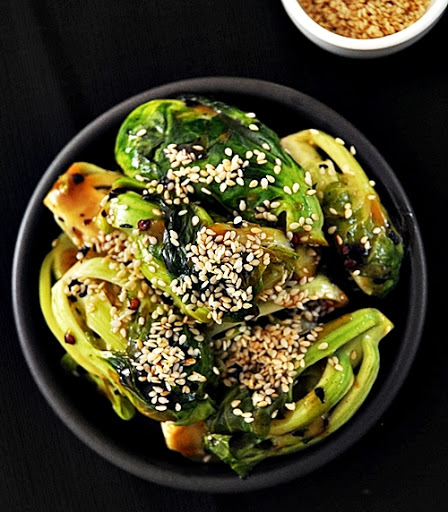 Add cornflour mixture to the sauce and boil on high heat until thickens. Spoon the sauce over the Brussels sprouts and sprinkle with sesame seeds just before serving. Best served with rice.