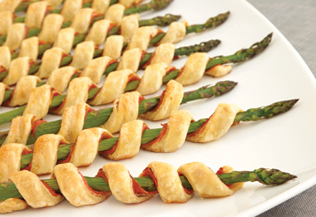Easy to prepare, but oh so elegant...these tempting appetizers feature asparagus spears individually wrapped with prosciutto, garlic & herb cheese and flaky puff pastry.