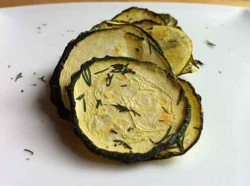 Slice zucchini chips very thinly and toss into a large bowl. Squeeze the juice of your lemon over the zucchini and chop about 1 cup of fresh dill. Sprinkle over top and mix together with a large spoon.