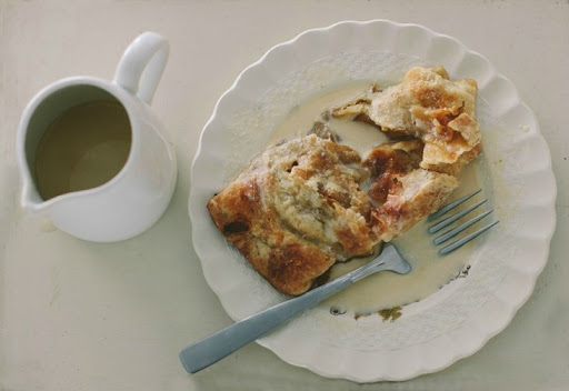 When the muldoshin has finished cooking, remove it from the oven and let it cool for a few minutes. Remove the muldoshin from the pan, and place on a serving dish or individual plates. Serve with the apple cider-cream sauce, pouring generously over each piece.